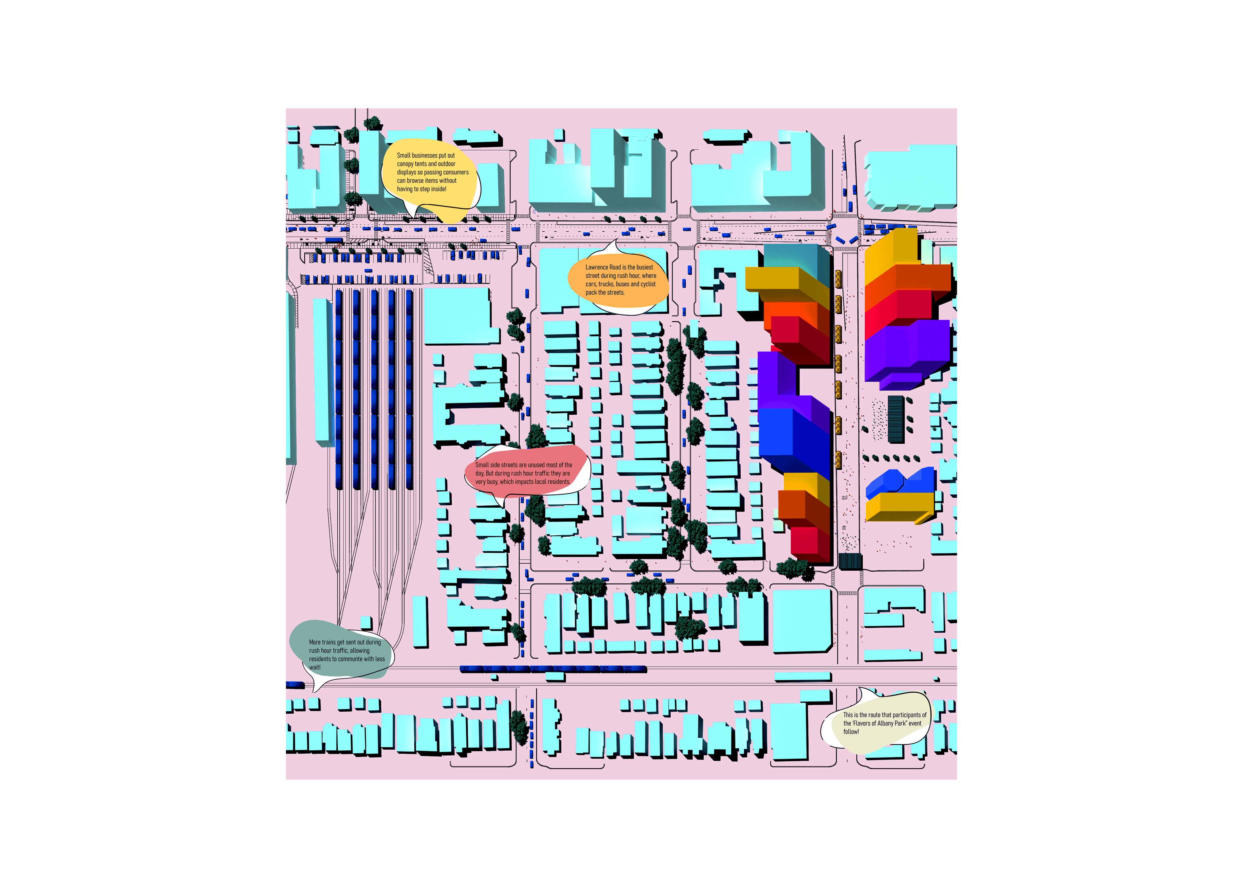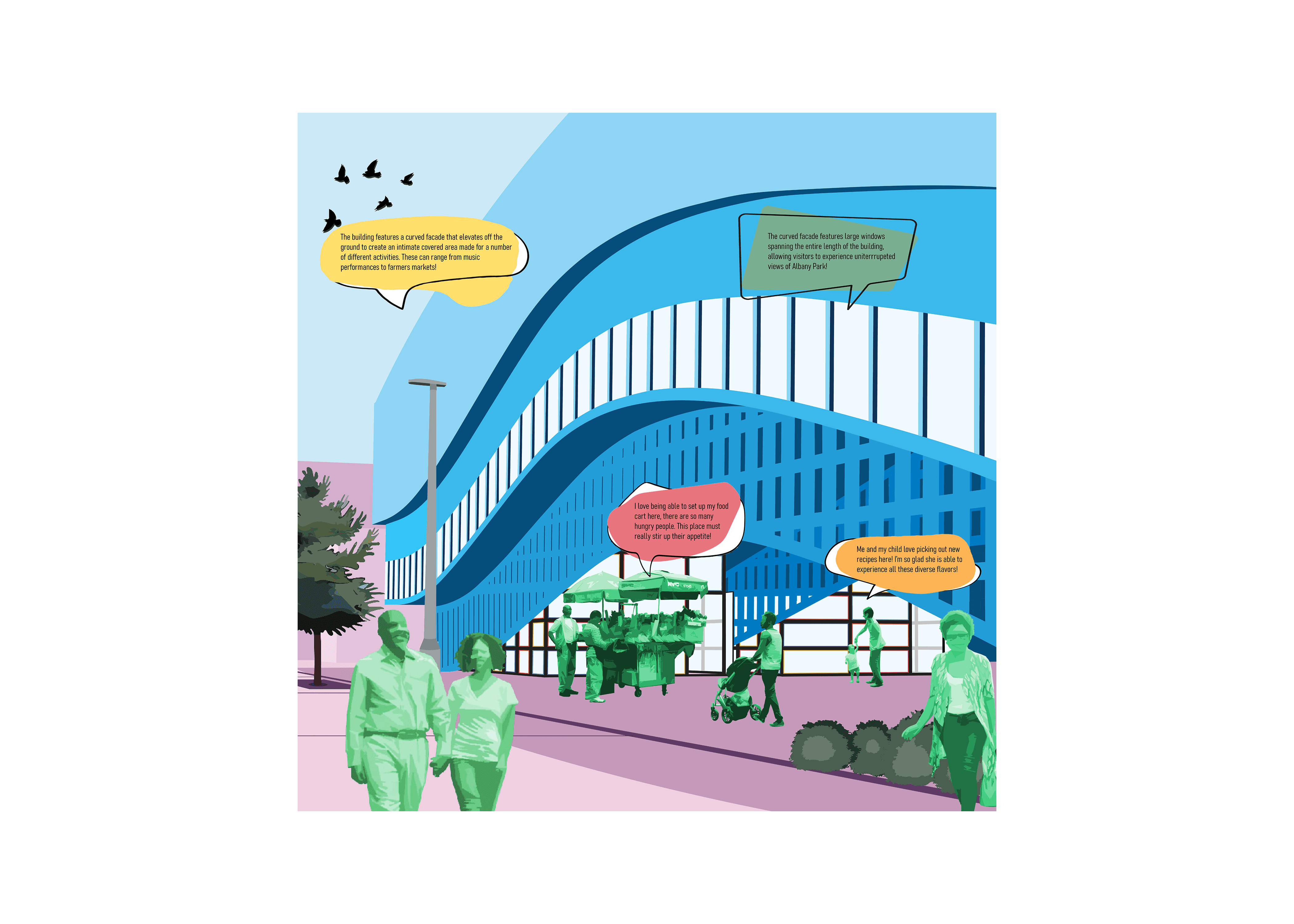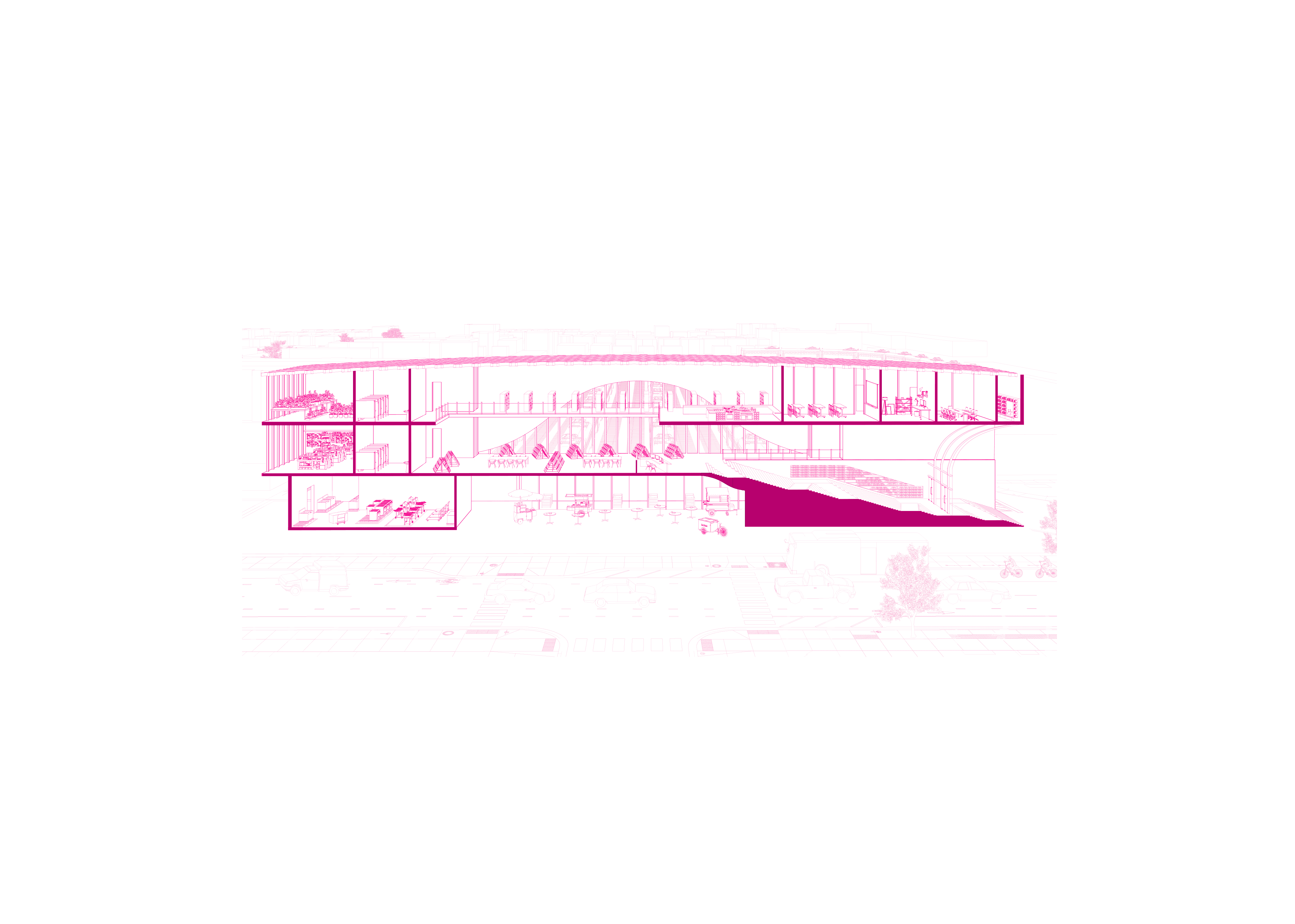 Located in Albany Park, IL, La Cocina is a culinary library that serves as a beacon for community engagement—inviting residents to gather, exchange dishes across cultures, and celebrate the art of cooking. Its inventory ranges from small-scale items such as utensils and recipe booklets to larger equipment like grills and smokers, all specially curated to reflect the diverse cultural fabric of Albany Park. The building’s entry is oriented toward the neighborhood’s primary transportation hub and articulated with bold architectural gestures to draw commuters inward. As users move through La Cocina, they experience moments of compression and expansion, guided by light that animates the interior and enriches their spatial journey.