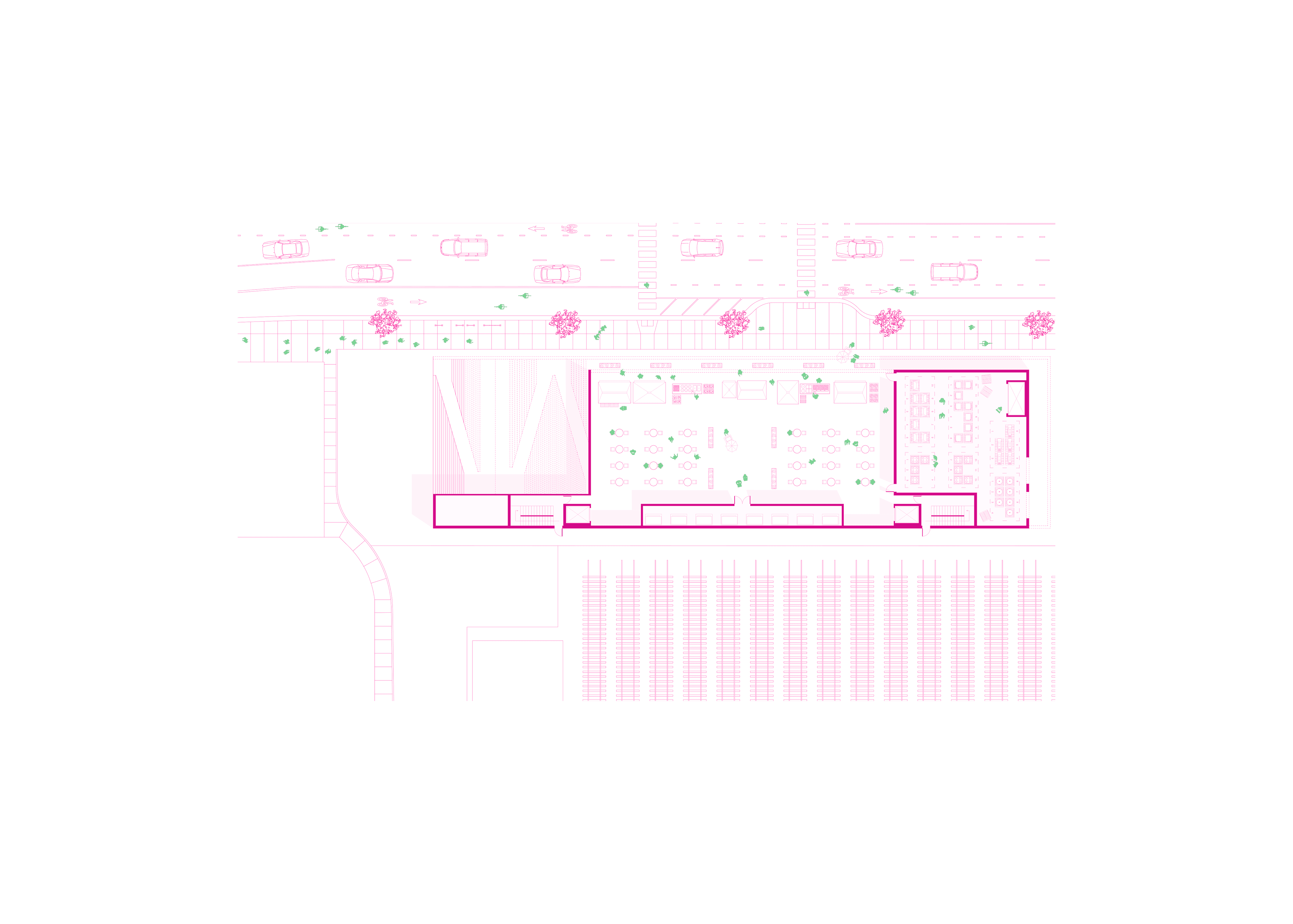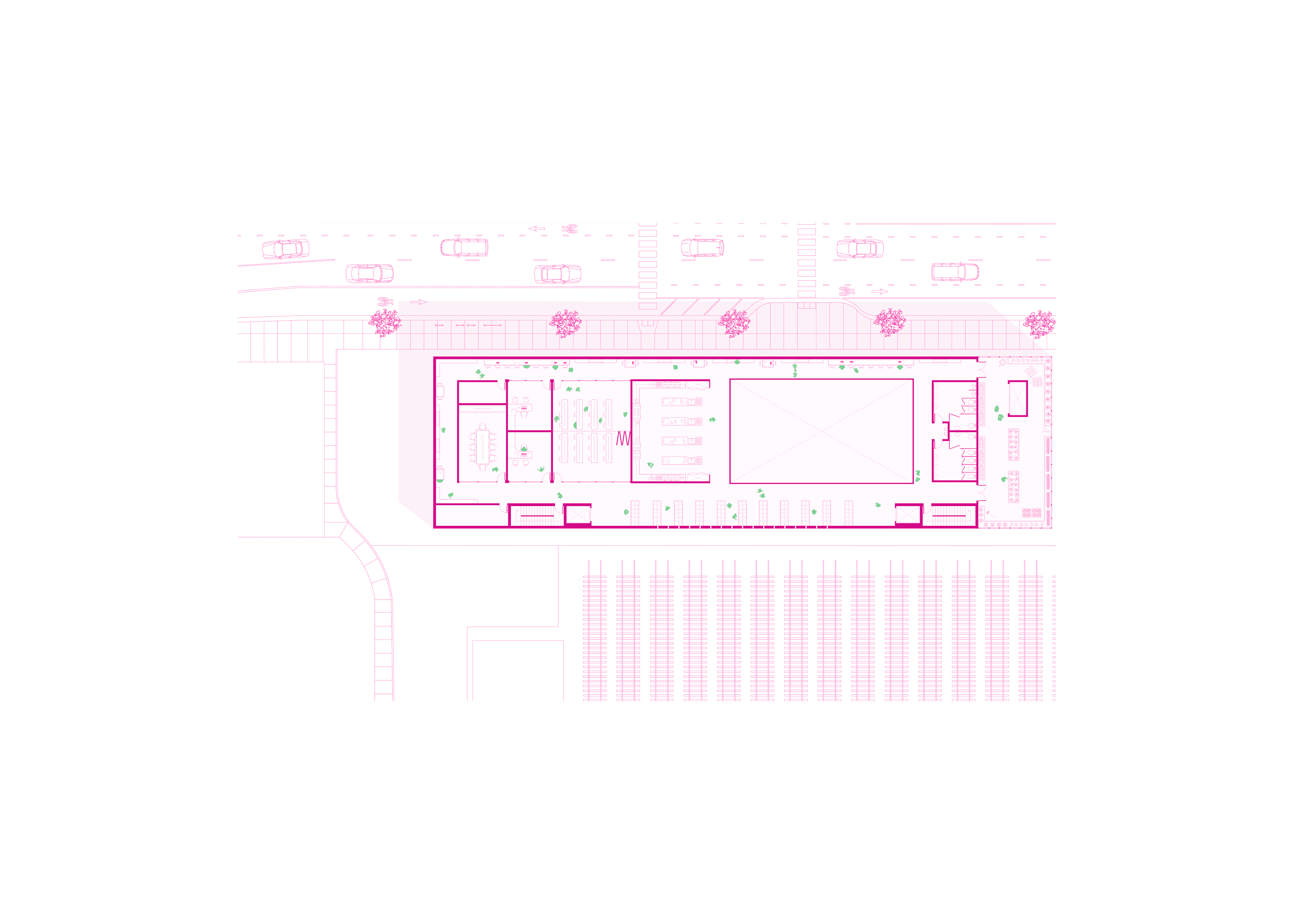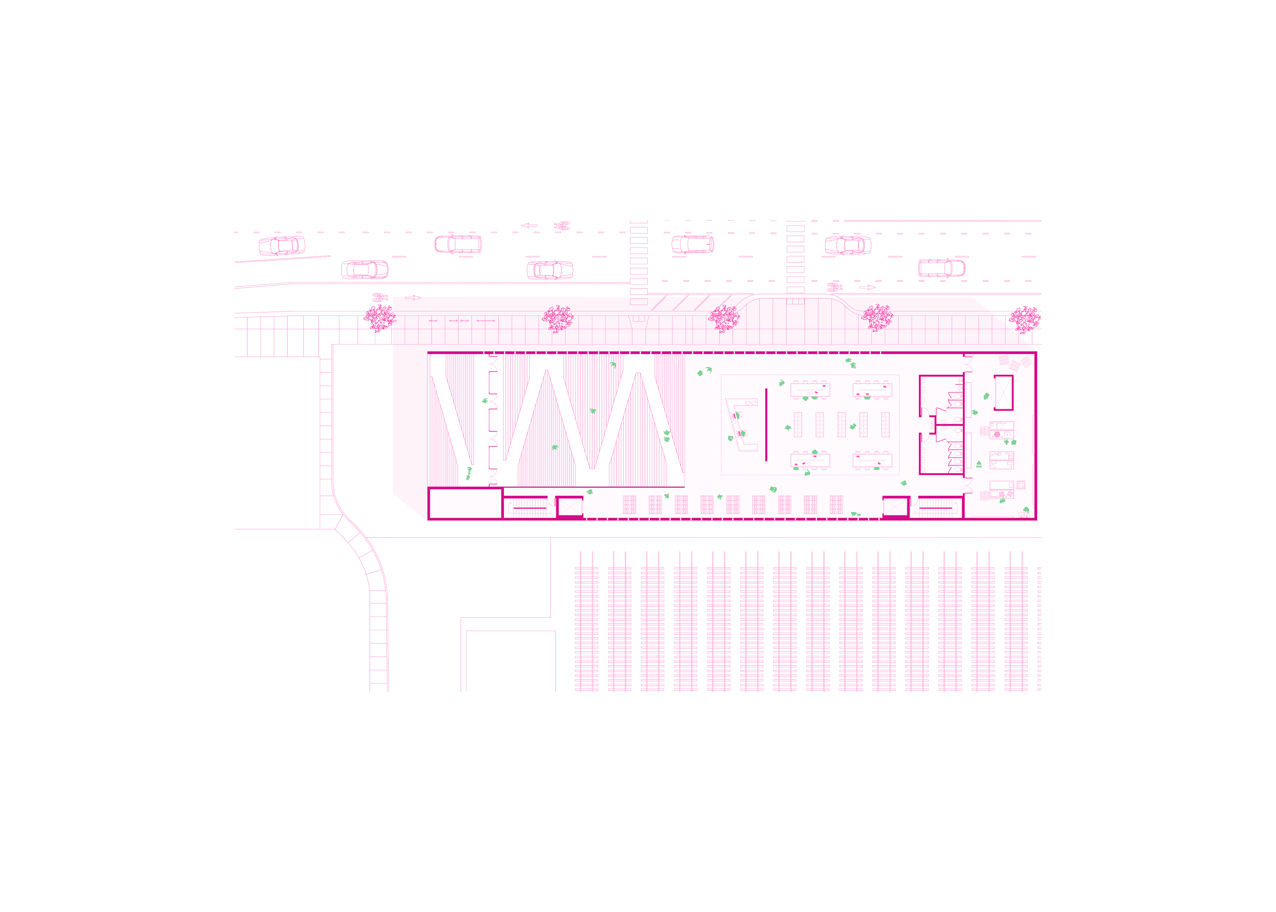 Located in Albany Park, IL, La Cocina is a culinary library that serves as a beacon for community engagement—inviting residents to gather, exchange dishes across cultures, and celebrate the art of cooking. Its inventory ranges from small-scale items such as utensils and recipe booklets to larger equipment like grills and smokers, all specially curated to reflect the diverse cultural fabric of Albany Park. The building’s entry is oriented toward the neighborhood’s primary transportation hub and articulated with bold architectural gestures to draw commuters inward. As users move through La Cocina, they experience moments of compression and expansion, guided by light that animates the interior and enriches their spatial journey.